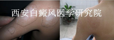病例治疗:患者于2010年9月初来我院接受专业治疗,专家根据患者的描述和实际情况建议患者进行体内微量元素、病灶部位伍德灯检查,检查结果显示铜离子下降,处于白癜风初发期,经过一段时间免疫力调节,专家开始为其实施“黑色素细胞培植术”治疗,经过4周的治疗,患者白斑部位长出色素,面积逐渐缩小,又经过4周的巩固治疗,患者白癜风部位恢复正常肤色。